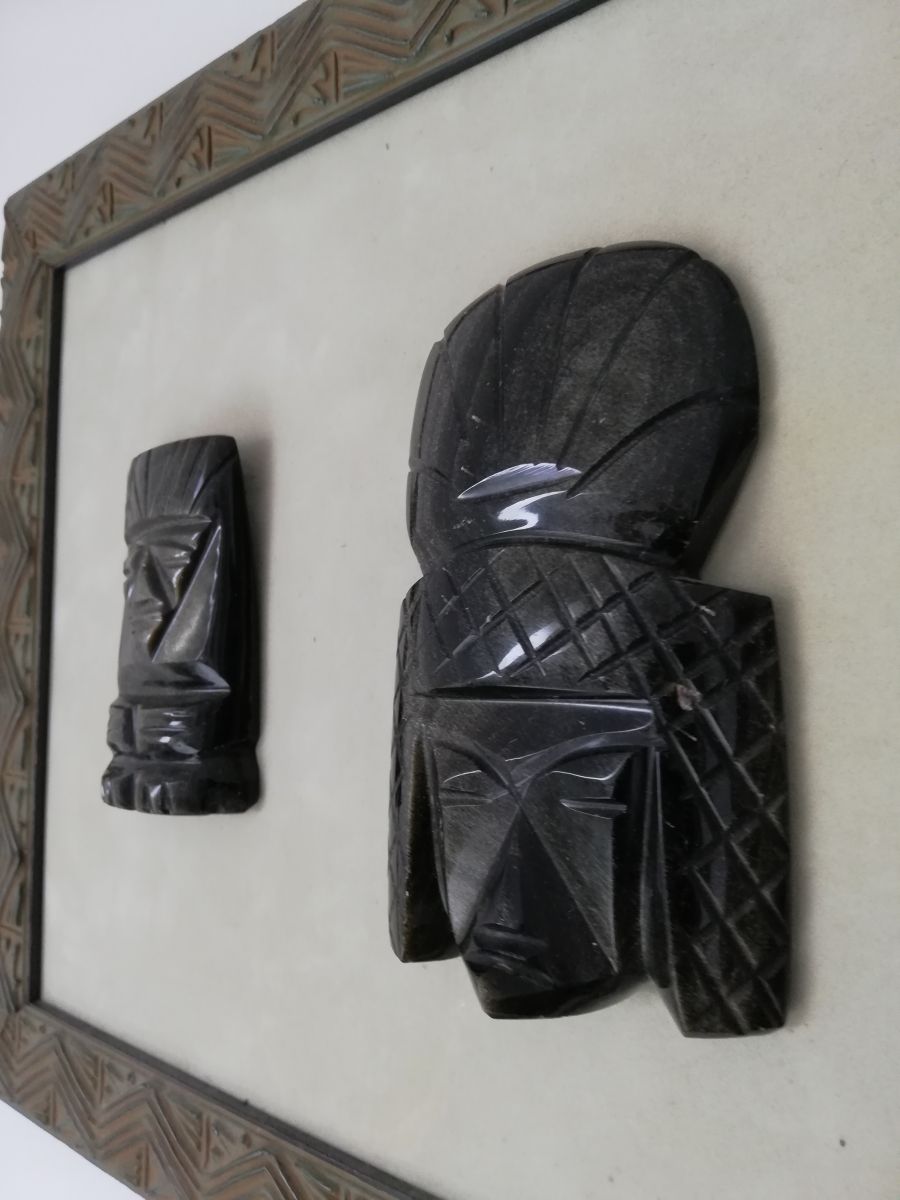 Tableau décoratif avec 2 Statuettes Mexicaine en Obsidienne "Maya".L¿obsidienne noire est une pierre d¿origine volcanique. On l¿a longtemps utilisée pour fabriquer des outils et des armes, et elle a même servi à créer des ustensiles médicaux. C¿est une pierre sacrée dans de nombreux pays, qui est aussi souvent utilisée pour confectionner des bijoux.L¿obsidienne est une pierre fortement protectrice qui forme un bouclier contre la négativité, elle absorbe les énergies négatives, considérée comme une pierre de protection très personnelle, c¿est un talisman merveilleux pour protéger les âmes douces et celles qui sont très sensibles.