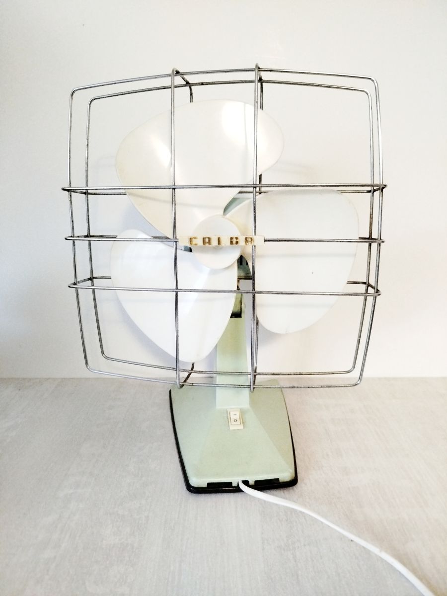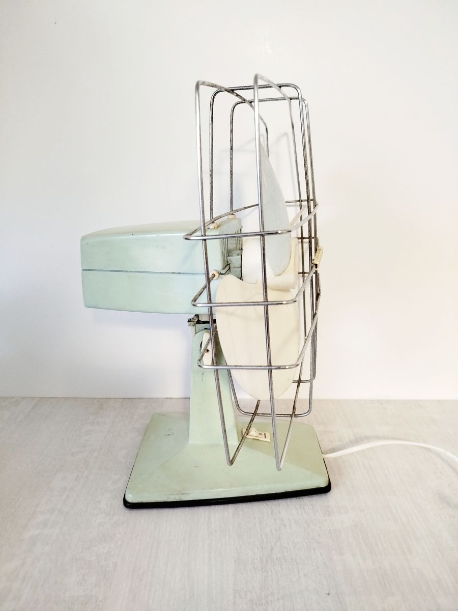 Superbe ventilateur vintage CALOR des années 1960-1970, en bakélite vert amande et métal chromé.