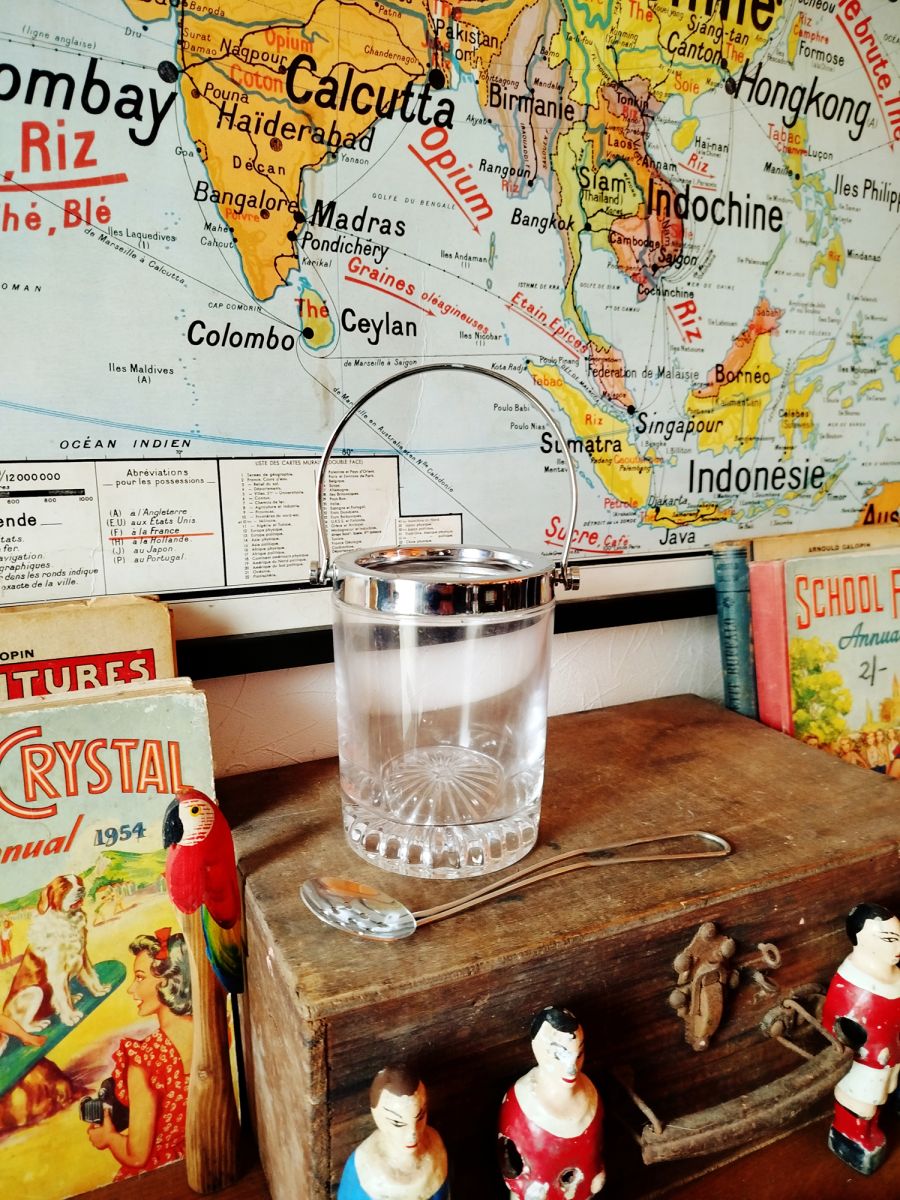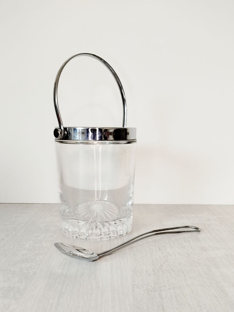 Sceau à glace vintage en verre ciselé et métal chromé
