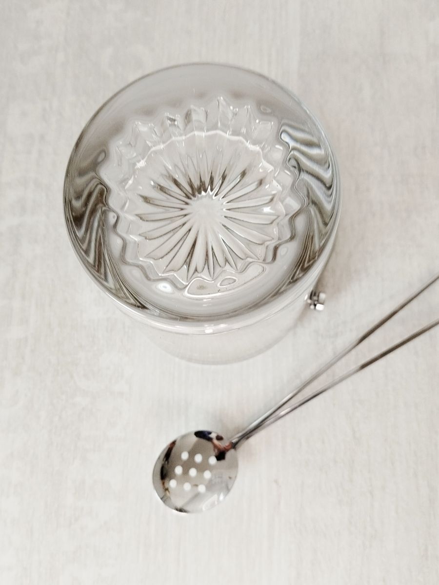 Superbe sceau à glace vintage en verre ciselé, doté d’une monture et d’une anse en métal chromé.