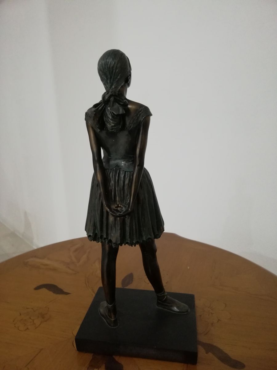 Reproduction de la petite danseuse de l'opéra d'égar quinet. La sculpture représente une jeune ballerine debout dans une attitude de repos très ordinaire chez les ballerines, les pieds en dehors, en appuie sur la jambe arrière. H 29,5 cm / L 12 cm / l 9 cm.