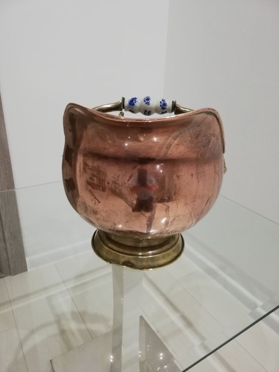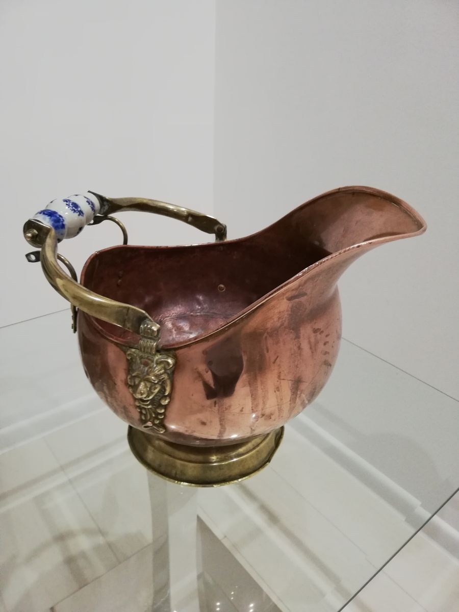 Ancien pot à charbon en cuivre rouge et jaune avec poignées en porcelaine. Aujourd'hui cet objet peu très bien servire de cache pot pour fleurs ou de décoration. H 27 cm L 33 cm l 27 cm