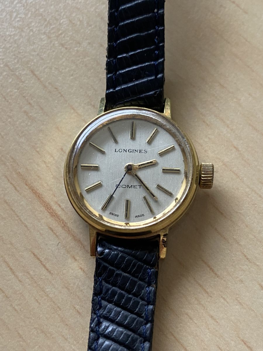 Montre Femme Longines en état de fonctionnement. Modèle Comet. Des années 60. Diamètre du verre 24 mm. Bracelet en lézard.