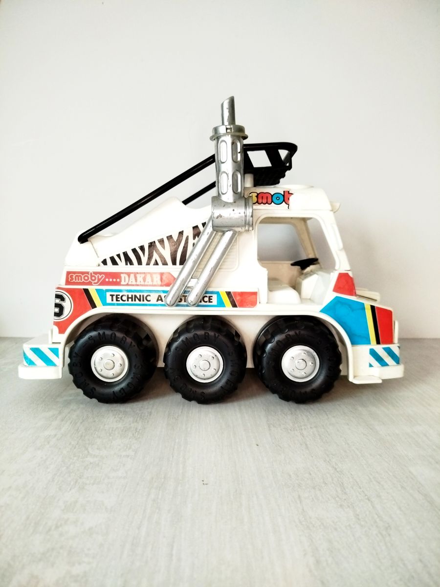 Camion dépanneur Rallye Dakar vintage de la marque Smoby – Mob Superjouet, emblématique des jouets français des années 70/80. Ce modèle 6x6 à friction, robuste et ludique, reprend l’univers du rallye-raid avec sa décoration Dakar, ses roues tout-terrain et son équipement de dépannage intégré.