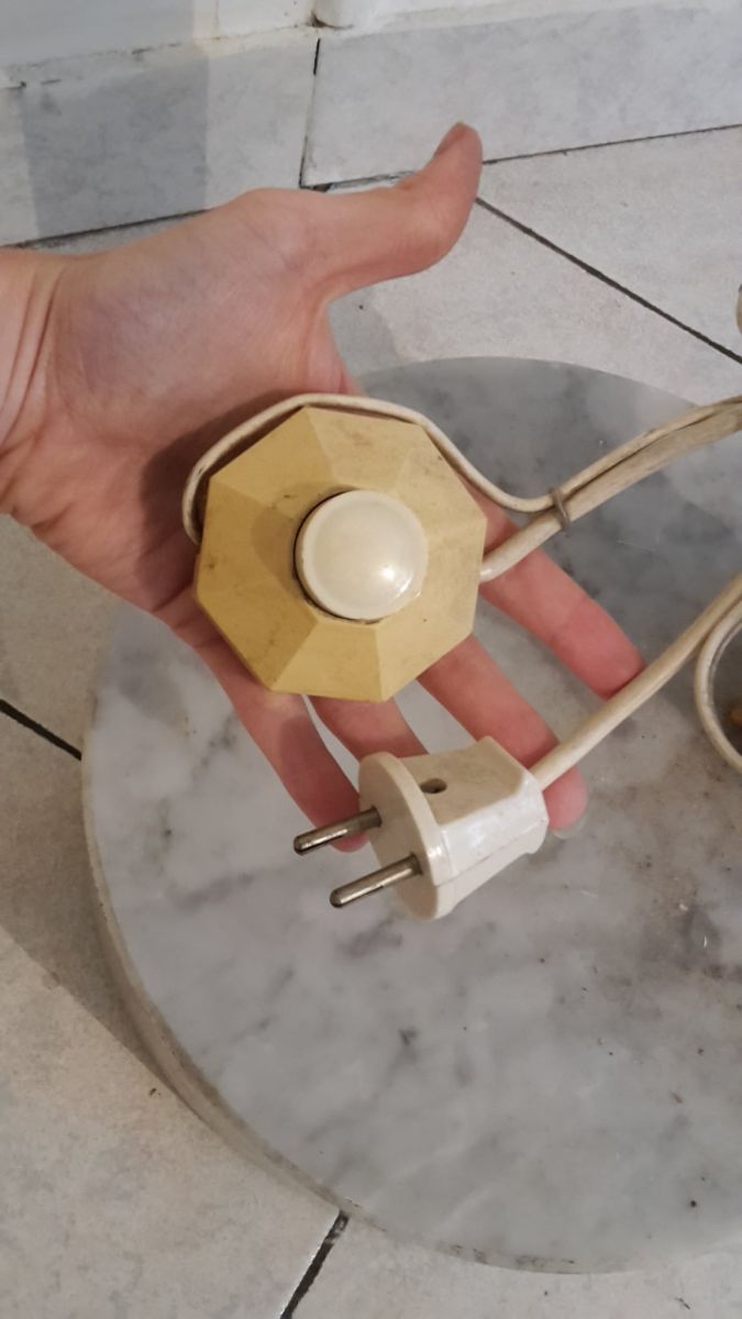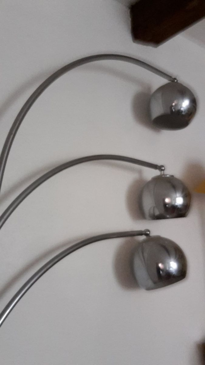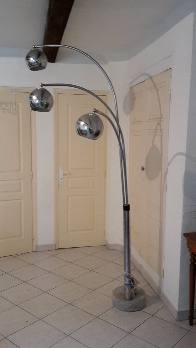 Socle rond en marbre + mat cylindrique avec 3 bras articulés pivotant en métal chromé se terminant par trois globes
