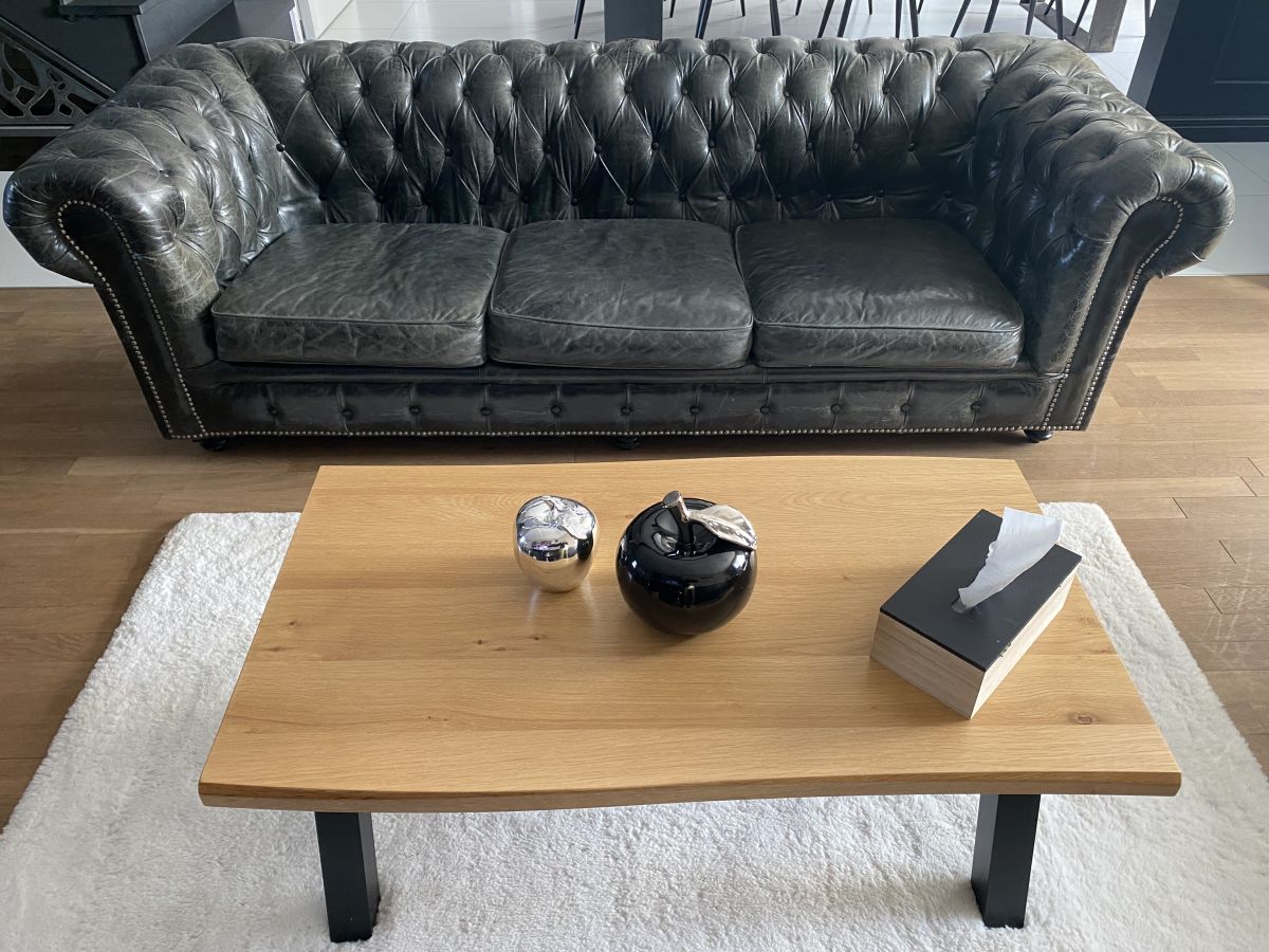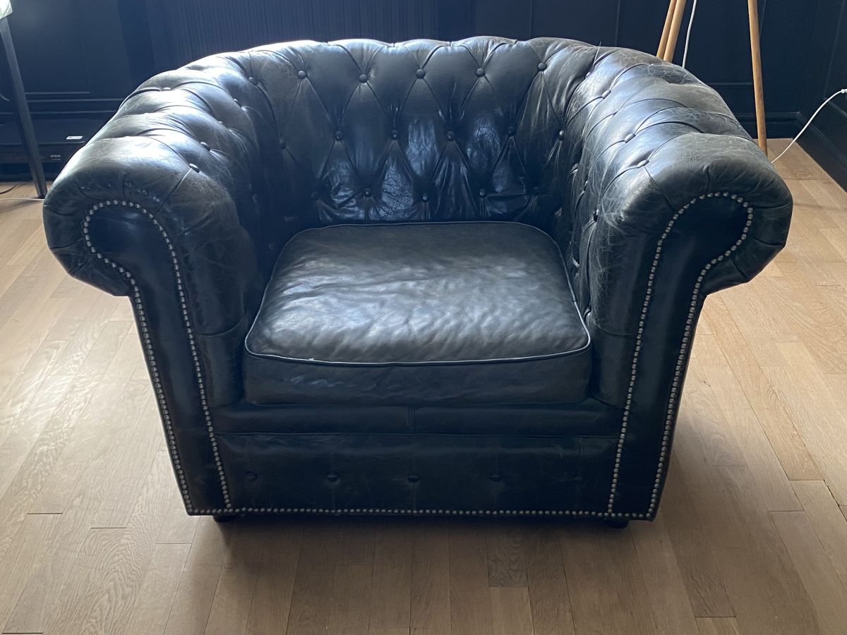 Cuir véritable de belle qualité avec patine naturelle, capitonnage traditionnel et finitions cloutées.