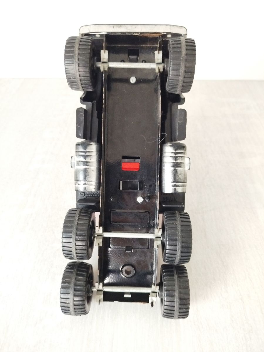 Authentique jouet vintage représentant un camion de transport NBC Company, modèle robuste à 6 roues, typique des grands camions américains. Ce jouet ancien séduit par son design rétro, ses couleurs vives et ses nombreux détails moulés : calandre chromée, échappements latéraux, vitrages teintés et décoration graphique d’époque.