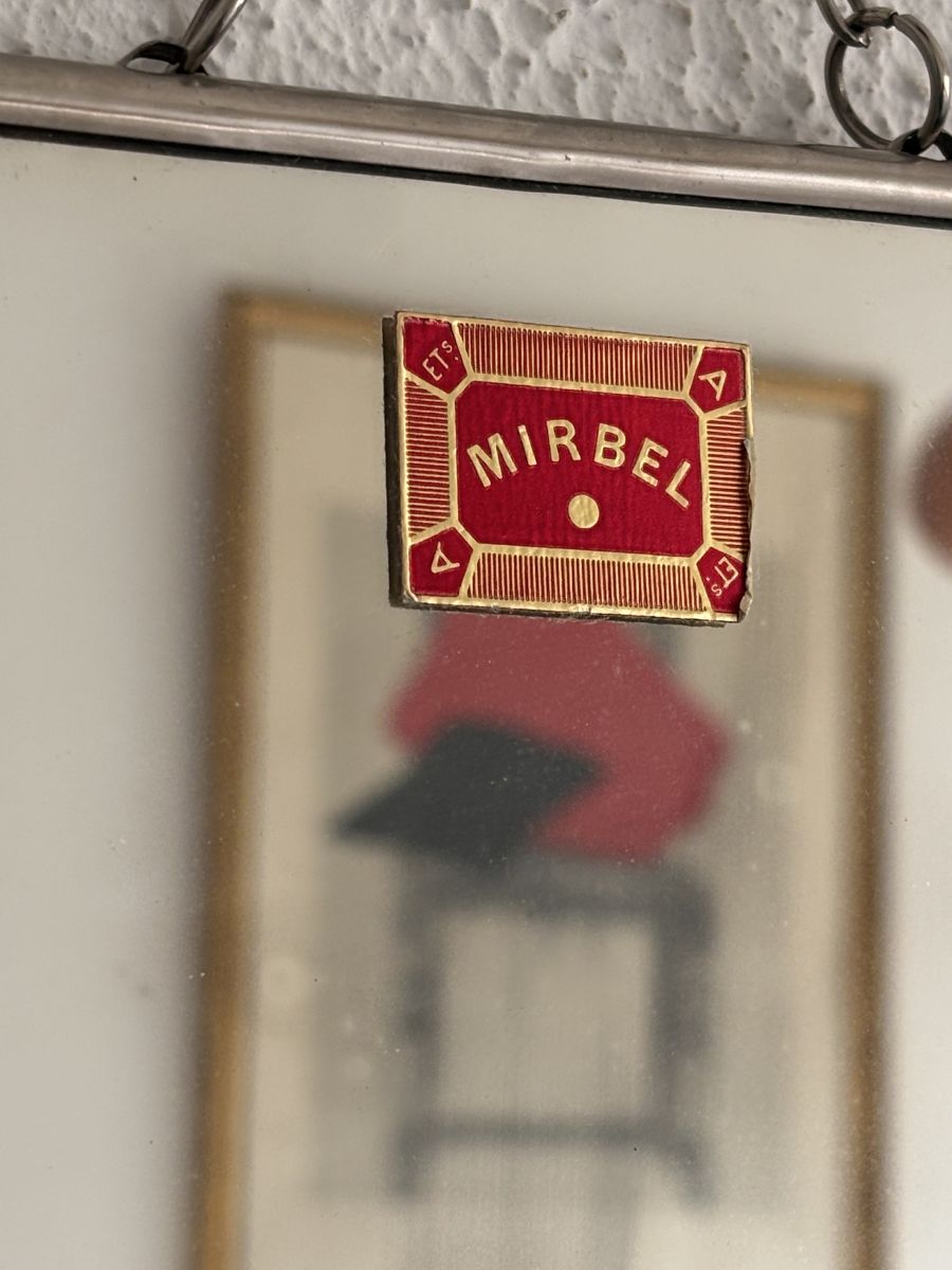 On trouve l'étiquette d'origine Mirbel Paris France sur le miroir central, c’est probablement un miroir qui n’a jamais été utilisé si on en croit son état rutilant.