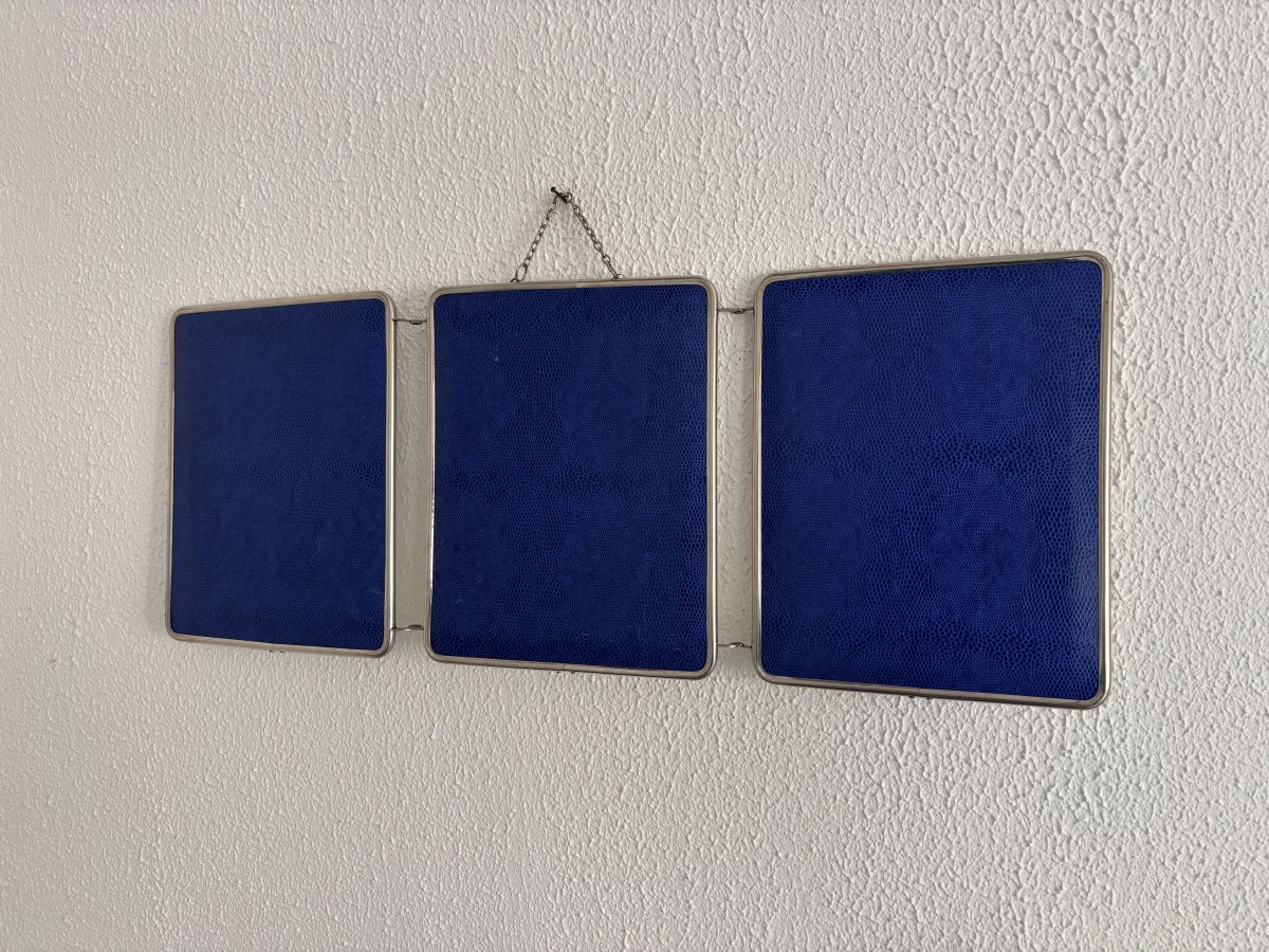 Ancien miroir triptyque de barbier coiffeur de la marque Mirbel en métal chromé et dos en simili lézard bleu Klein circa 1960 en bon état.
