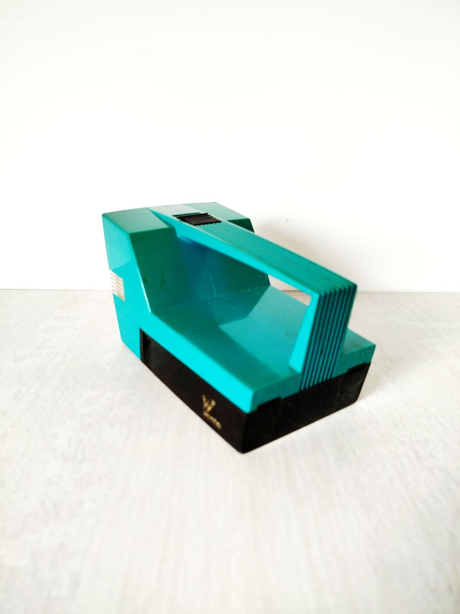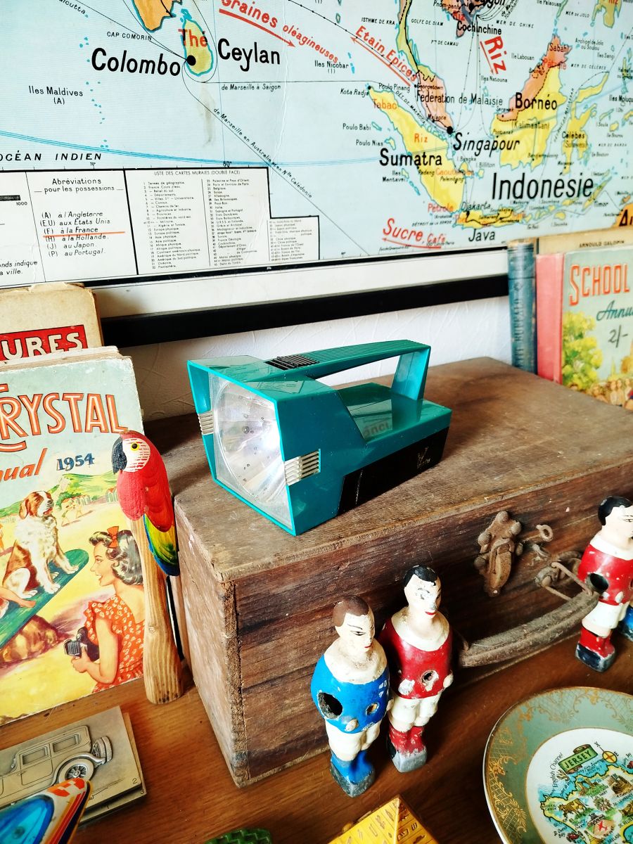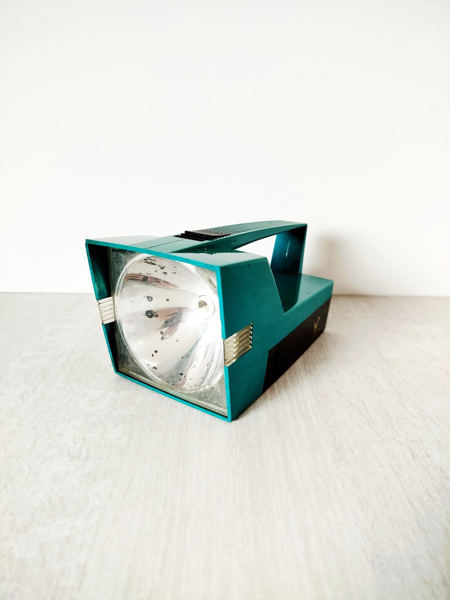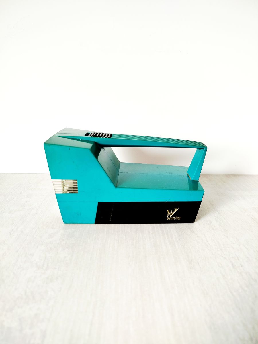 Ancienne lampe torche vintage modèle Pakbo, signée Wonder, au design résolument rétro typique des années 1970–1980. Son allure géométrique, sa poignée intégrée nervurée et sa couleur turquoise en font un bel objet décoratif autant qu’un accessoire de collection recherché.