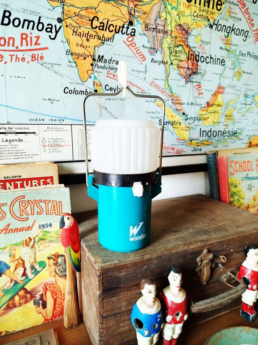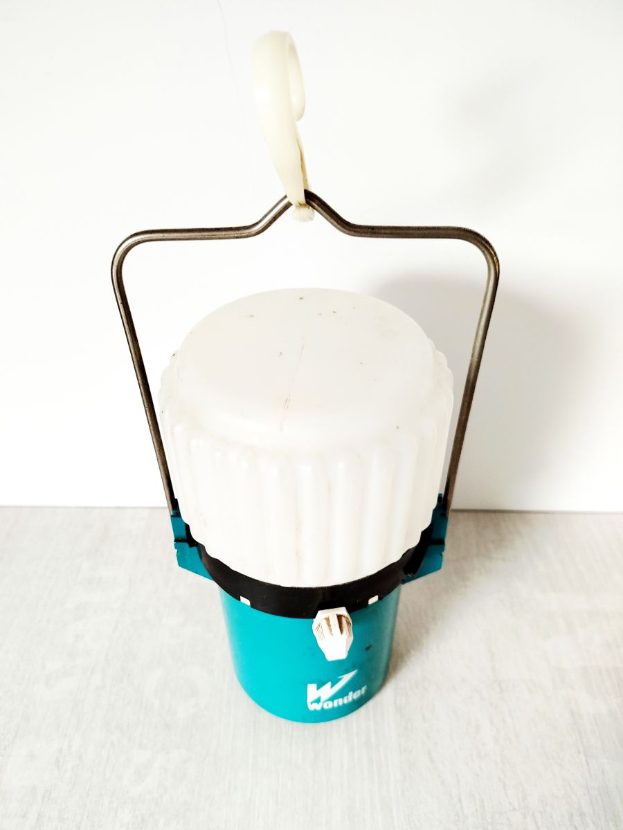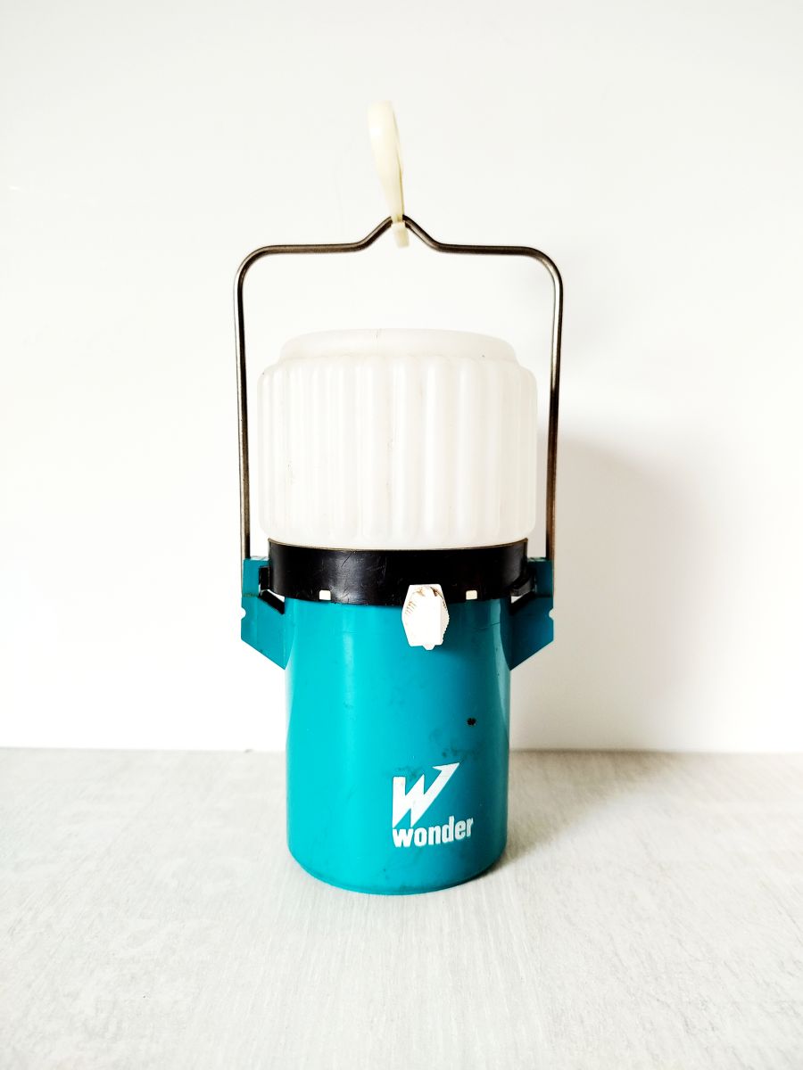Ancienne lampe de camping vintage modèle Auvan de la marque Wonder, au design iconique des années 1960/1970. Cette lanterne portable était destinée au camping, à la pêche ou aux usages extérieurs grâce à sa poignée métallique avec crochet de suspension.
