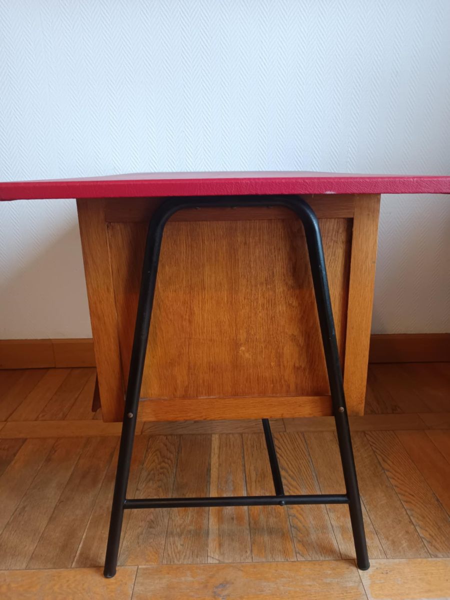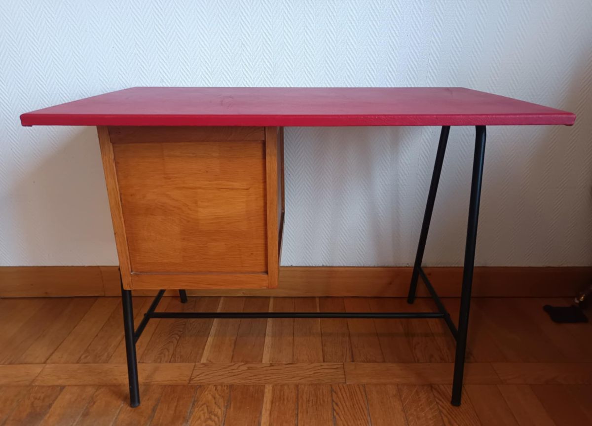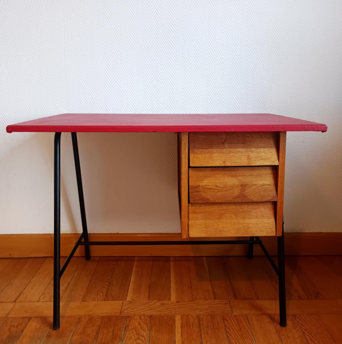 Caisson en bois à trois tiroirs, structure en métal laqué noir et plateau recouvert d'un Skaï rouge vif. Un audacieux mélange de matière pour ce petit bureau à la ligne totalement 1950, en témoignent ces trois tiroirs travaillés en diagonale.