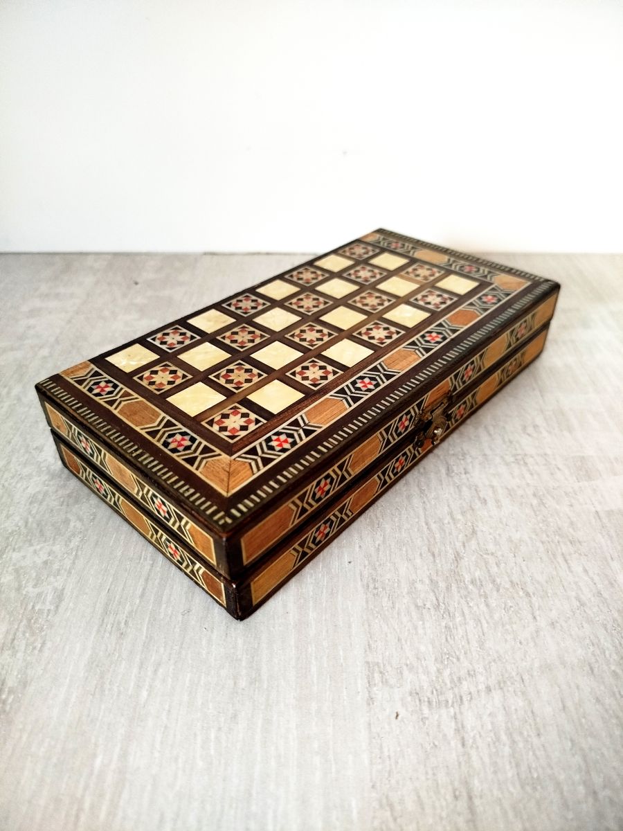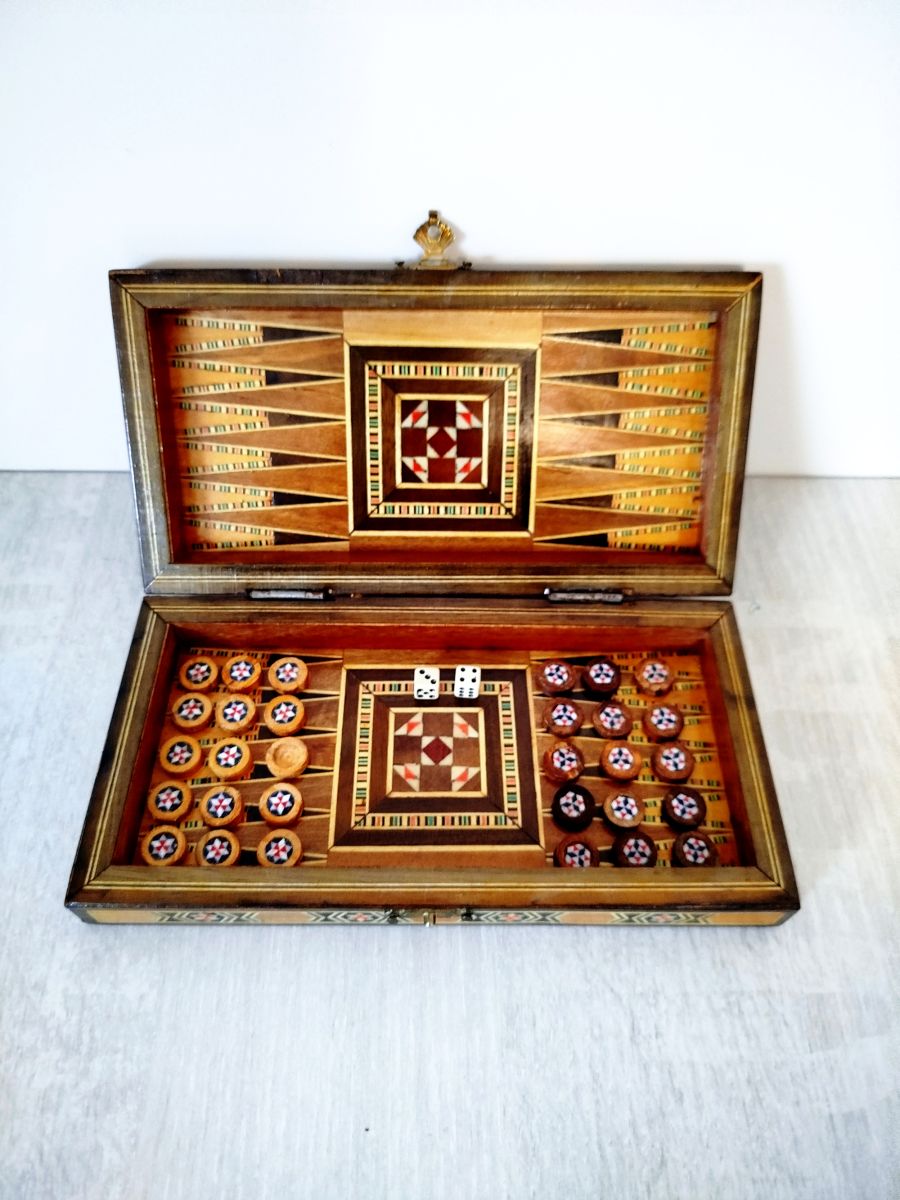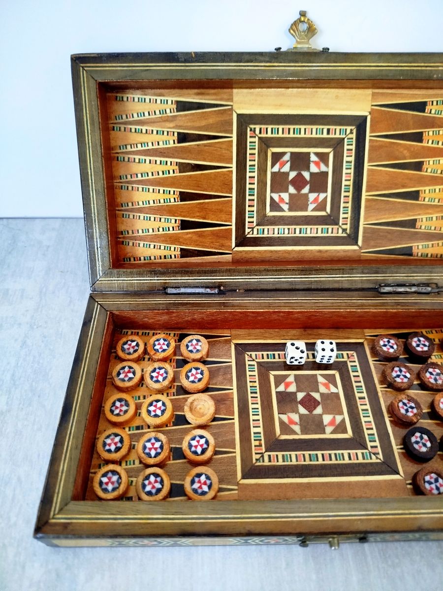 Ancien jeu de backgammon présenté dans une élégante boîte en bois pliable, richement décorée de motifs géométriques avec incrustations imitation nacre. Ce modèle compact allie jeu de stratégie et bel objet décoratif, parfait pour les amateurs de jeux anciens, de brocante ou de décoration vintage.