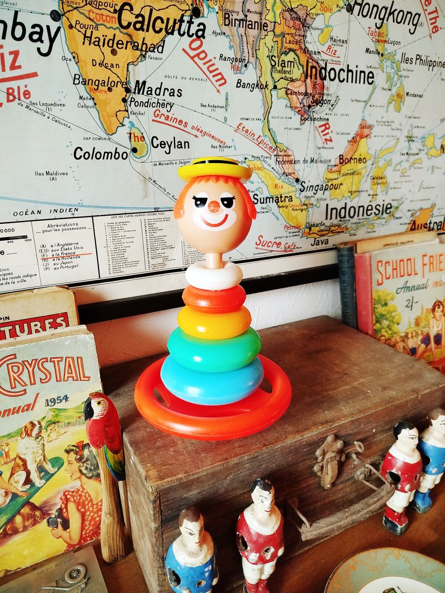 Charmant jeu d’anneaux à empiler vintage Educalux, représentant un clown coloré au look rétro.