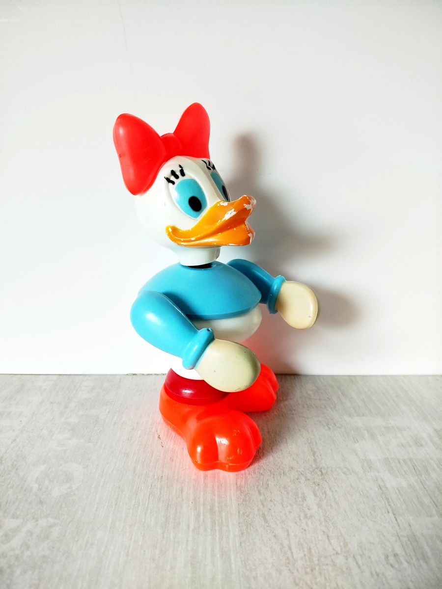 Rare et ancienne figurine Daisy Duck en plastique, au design typique des jouets Disney des années 1970 (fabricant exact non identifié, probablement issue d’une série produite en Europe).