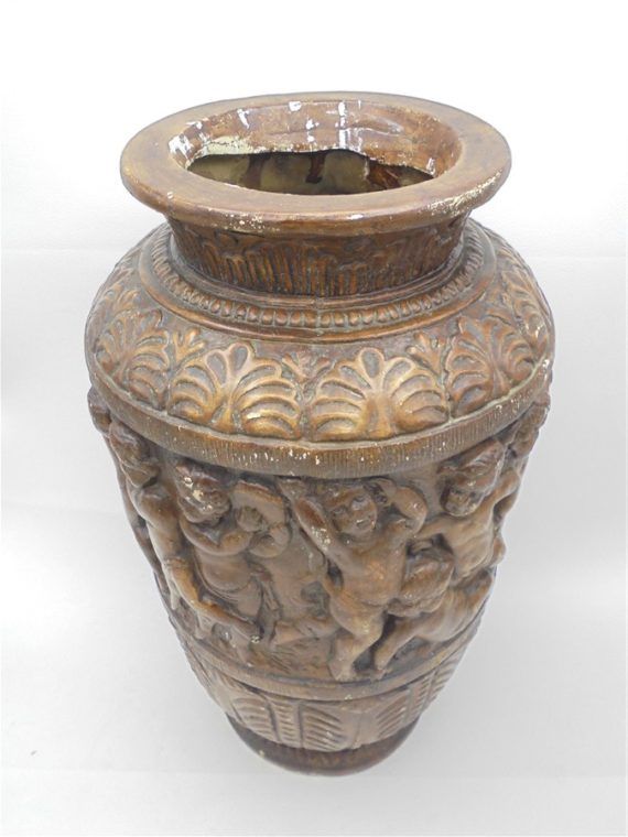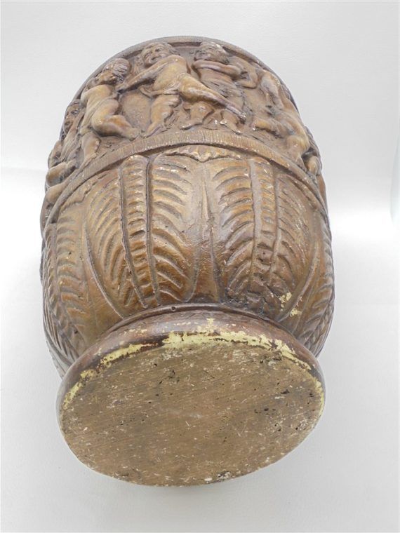 Pot ou vase en plâtre, avec de nombreux petits manques, décor d'enfants dansant et de feuilles d'acanthe.