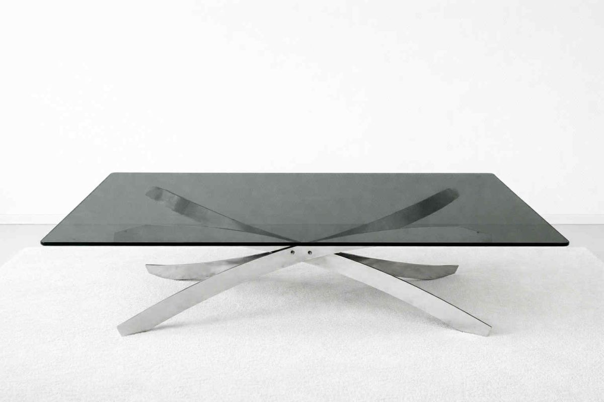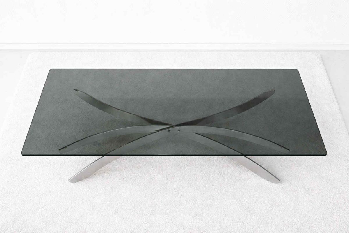 Pied en acier brossé et plateau rectangulaire en verre fumé.