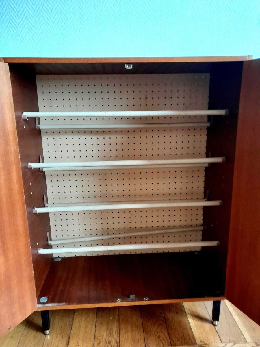 Meuble à chaussures en merisier, à deux abattants s'ouvrant sur des racks à chaussures avec fond perforé pour aération. Poignée d'époque en laiton, pied en métal à section carré avec une partie cylindrée en métal dorée réglable en hauteur (se visse).