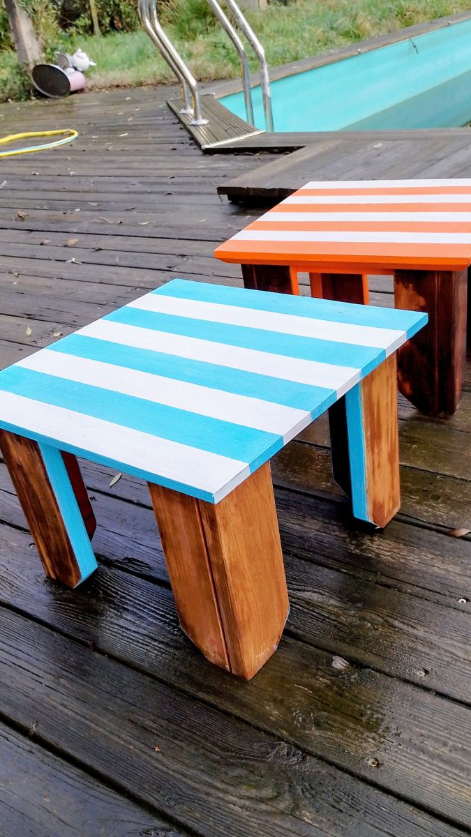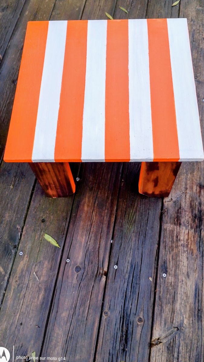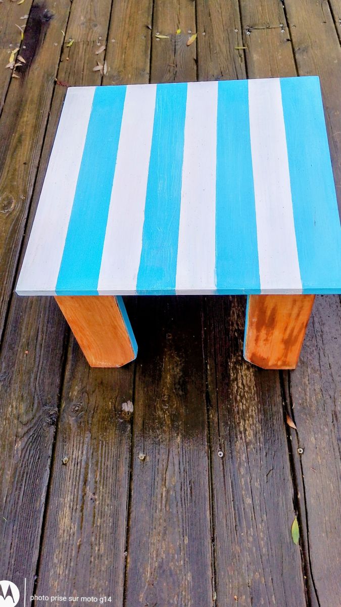 Vous trouverez une photo des meubles avant, et le reste après restauration : J'ai gardé le bois des pieds après avoir poncé, lasuré et vernis, et peint le dessus en bleu et blanc pour l'u, et orange et blanc pour l'autre... Ce qui donne 2 petits meubles de chevets très jolis dans un style vintage.