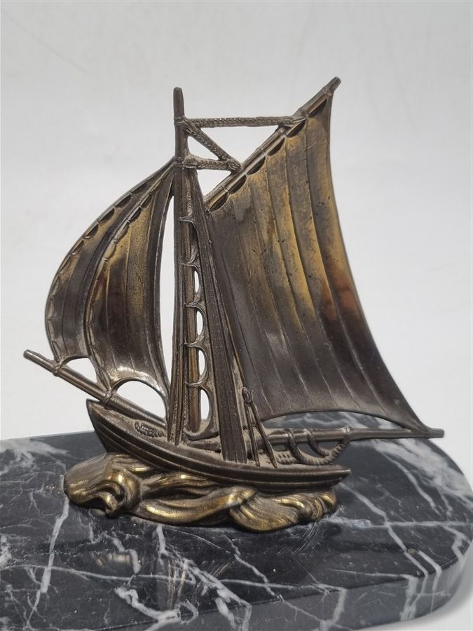 Son socle est en marbre noir veiné, il présente quelques rayures; le voilier est en régule avec une patine bronze; le pied sous le globe est un peu oxydé; le globe en verre est en bon état.