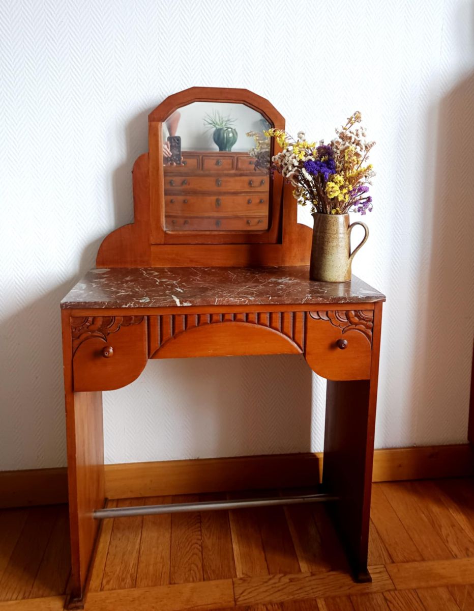Coiffeuse bois avec travail de décor de fleurs sur le tiroir. Plateau en marbre rose à veinures blanches. Entretoise faite d'une barre de métal cylindrique avec les embouts ronds ressortant sur les côtés. Miroir intégré dirigeable.