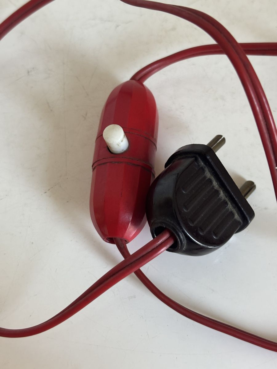 le câble électrique rouge est ancien, tout comme l’interrupteur zepelin d’origine assorti ainsi que la prise en Bakélite marron. Elle fonctionne avec ampoule à baïonnette non fournie.
