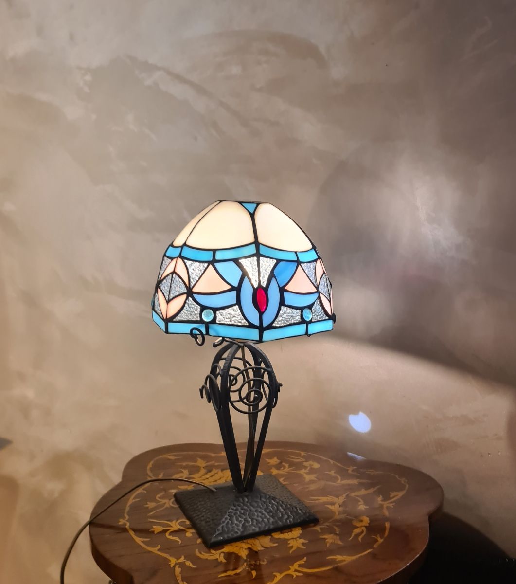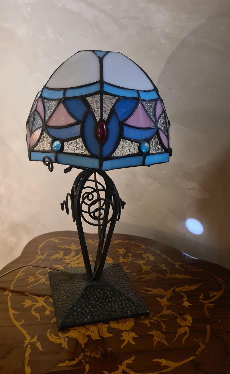 lampe fer forgé ancienne ,1900 a 30 avec abat jour verre vitrail soudé plomb 38x20 style tiffany ,