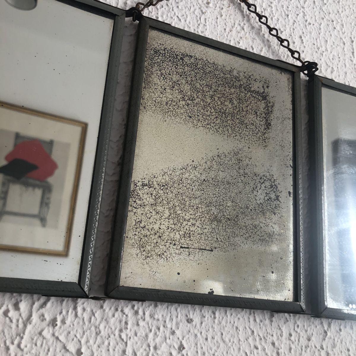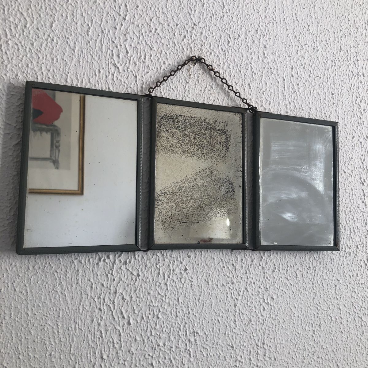 Ancien miroir triptyque de barbier en métal laqué gris ciment et papier circa 1940 en bon état.