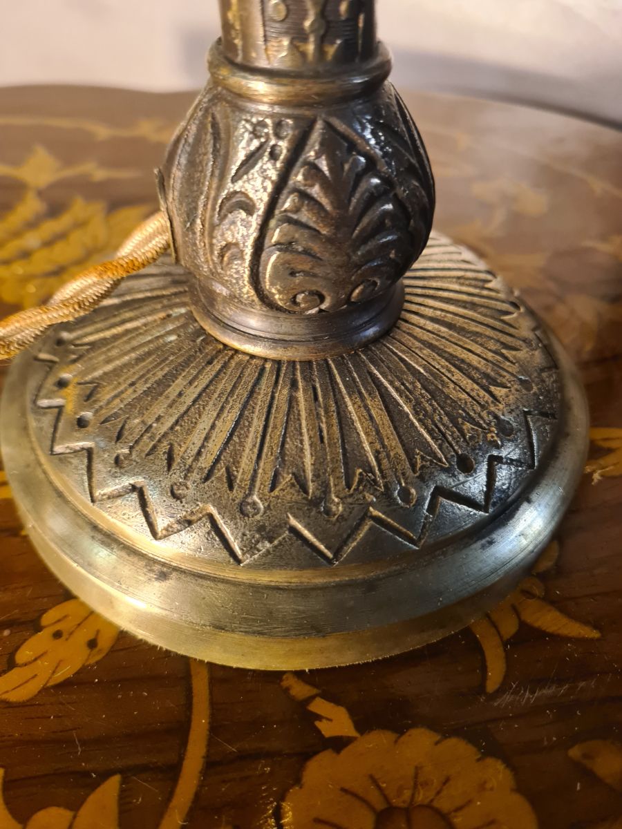 lampe, pied bronze ciselé 19e siècle ,et jolie abat jour vitrail verre soudé, elec restauré a neuf de la douille a la prise ,53x20