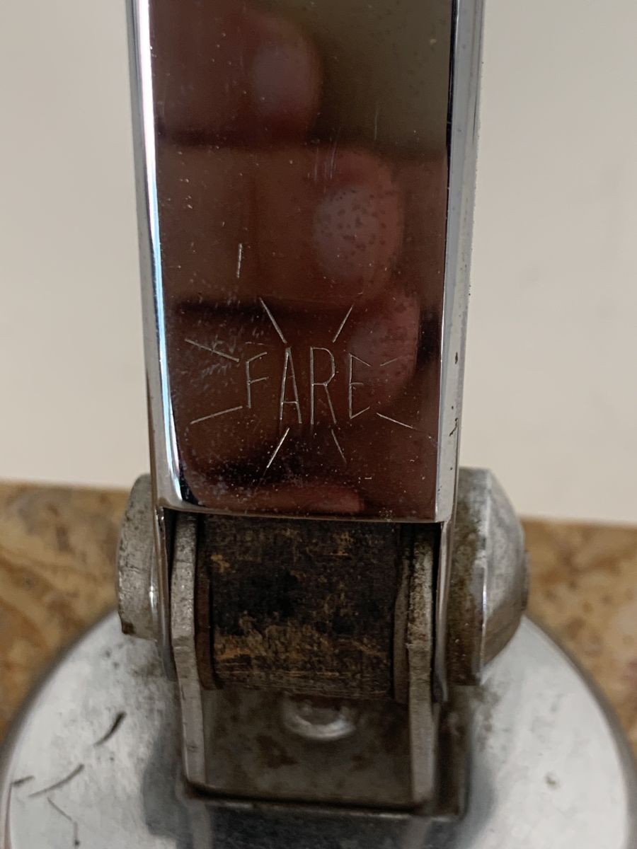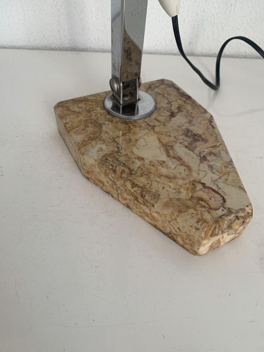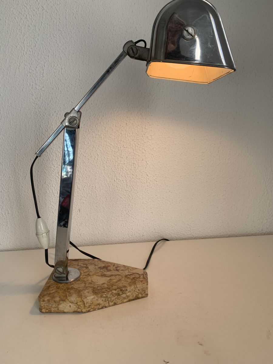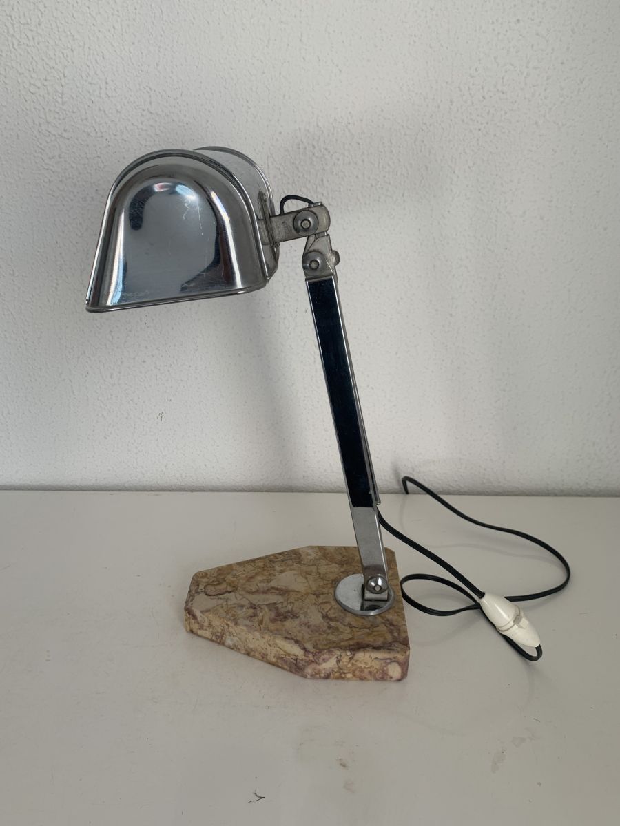 Ancienne lampe de bureau en métal chromé et marbre signée Fare à la base du bras du bas circa 1930 en bon état.
