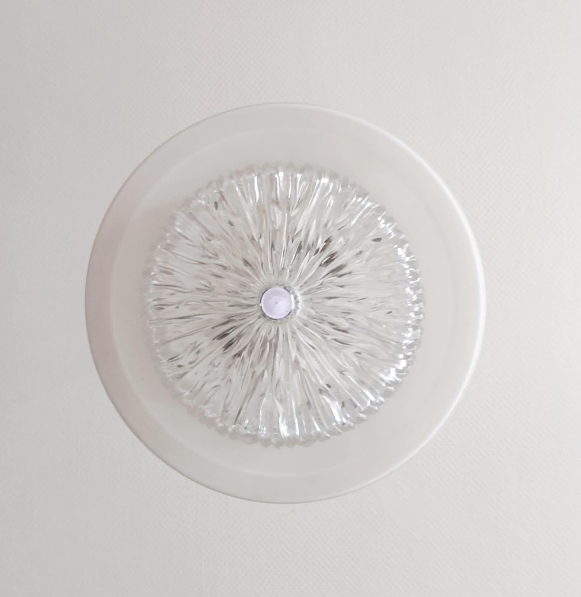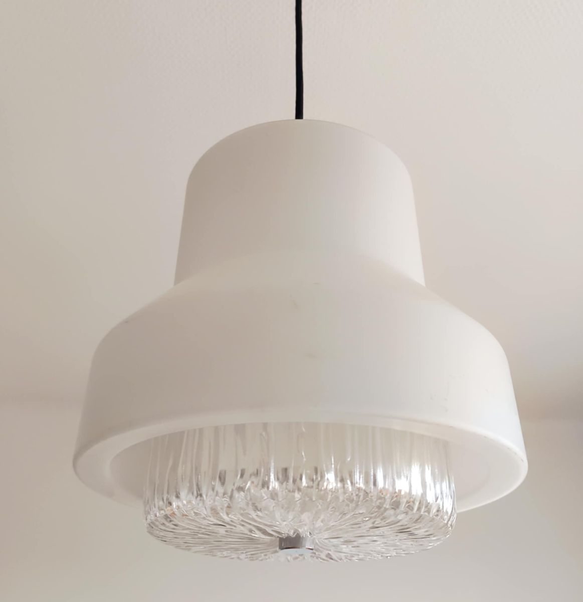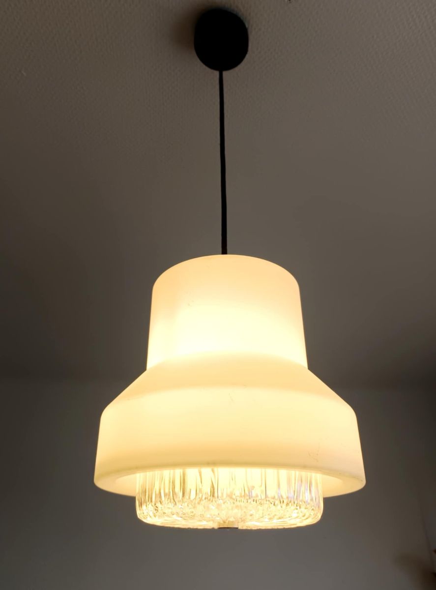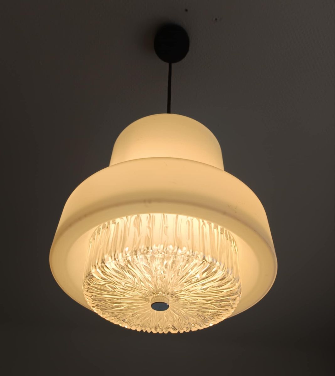 Suspension style space age vers 1970 / 1980 composée d'un globe en verre blanc dans lequel s'imbrique un globe rond en verre moulé texturé, fixé à la structure par un bouton rond en métal argenté. Support d'attache rond en métal argenté.
