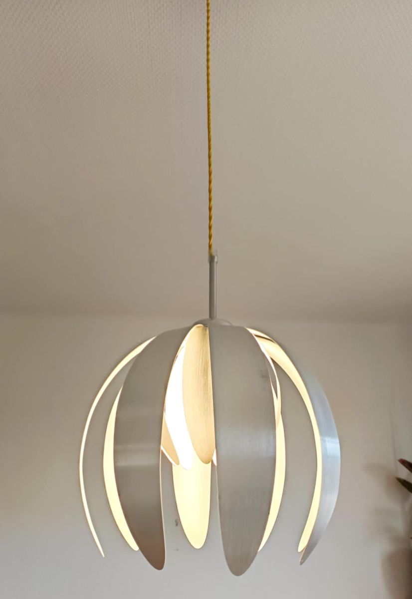 Suspension composée de plusieurs lamelles de métal brossé formant comme une fleur de lotus.