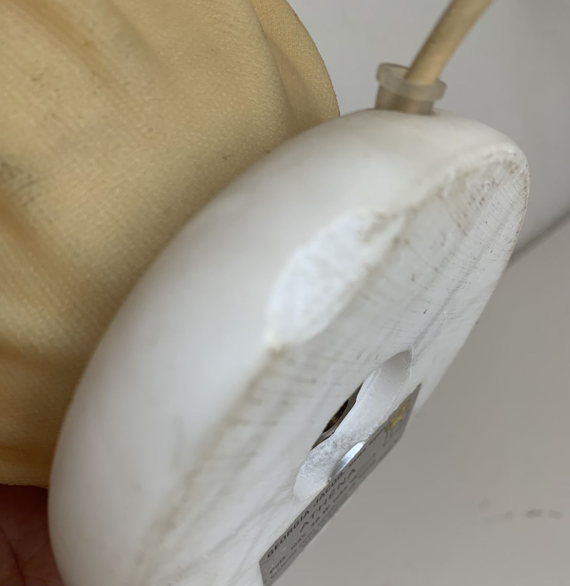 Les photos sont éloquentes, elle est en excellent état, le drappé couleur chair est un peu passé, la base en marbre blanc affiche un manque très discret.