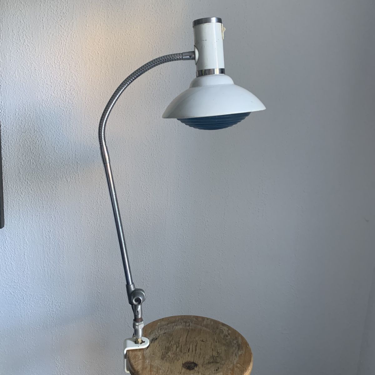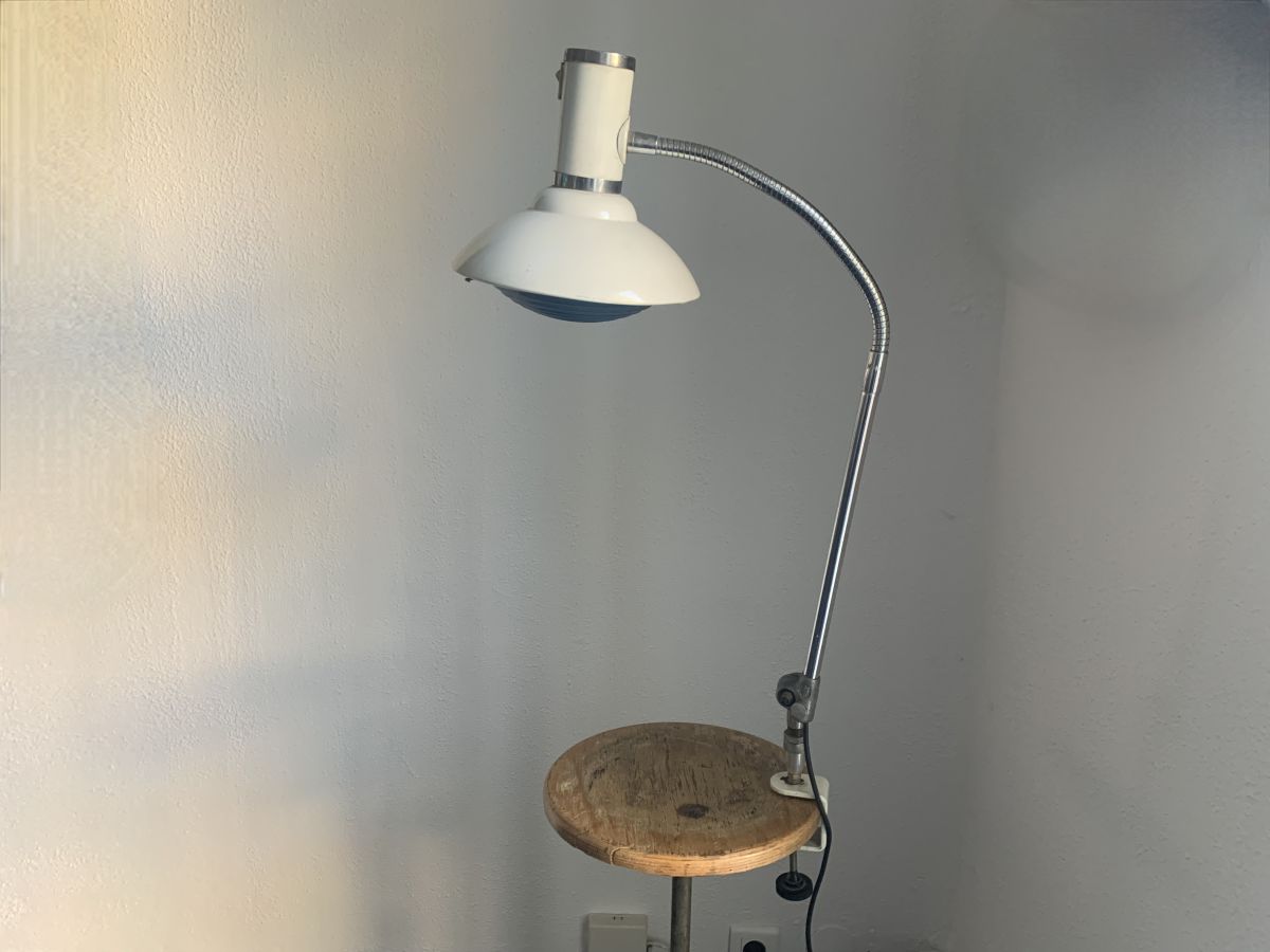 Ancienne lampe industrielle à étau en métal laqué blanc et métal chromé de la marque Solr par Ferdinand Solère circa 1960 en bon état.