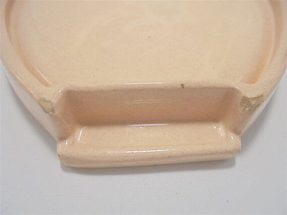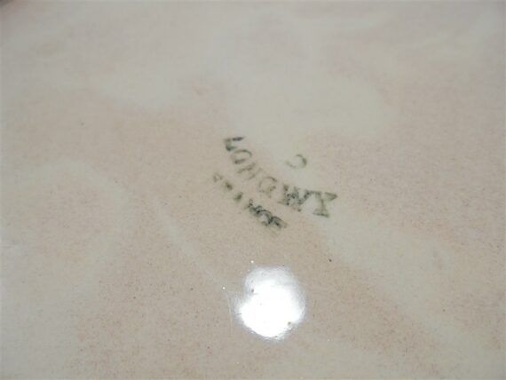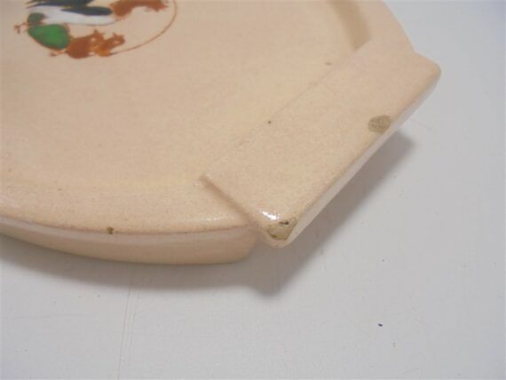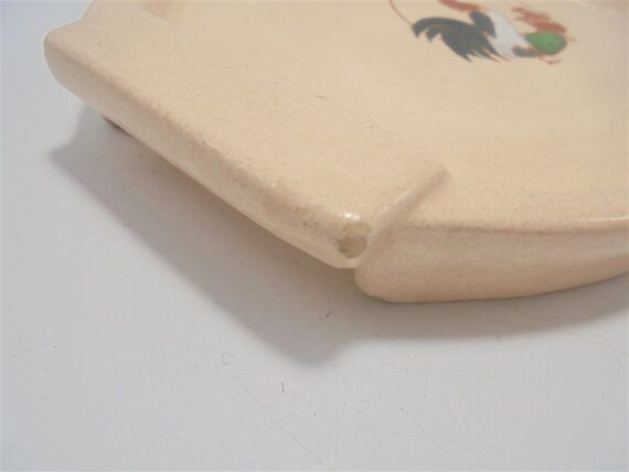 Mini plateau Longwy en céramique signée Longwy, au décor d'un coq et de 2 poussins sur fond rose pâle.