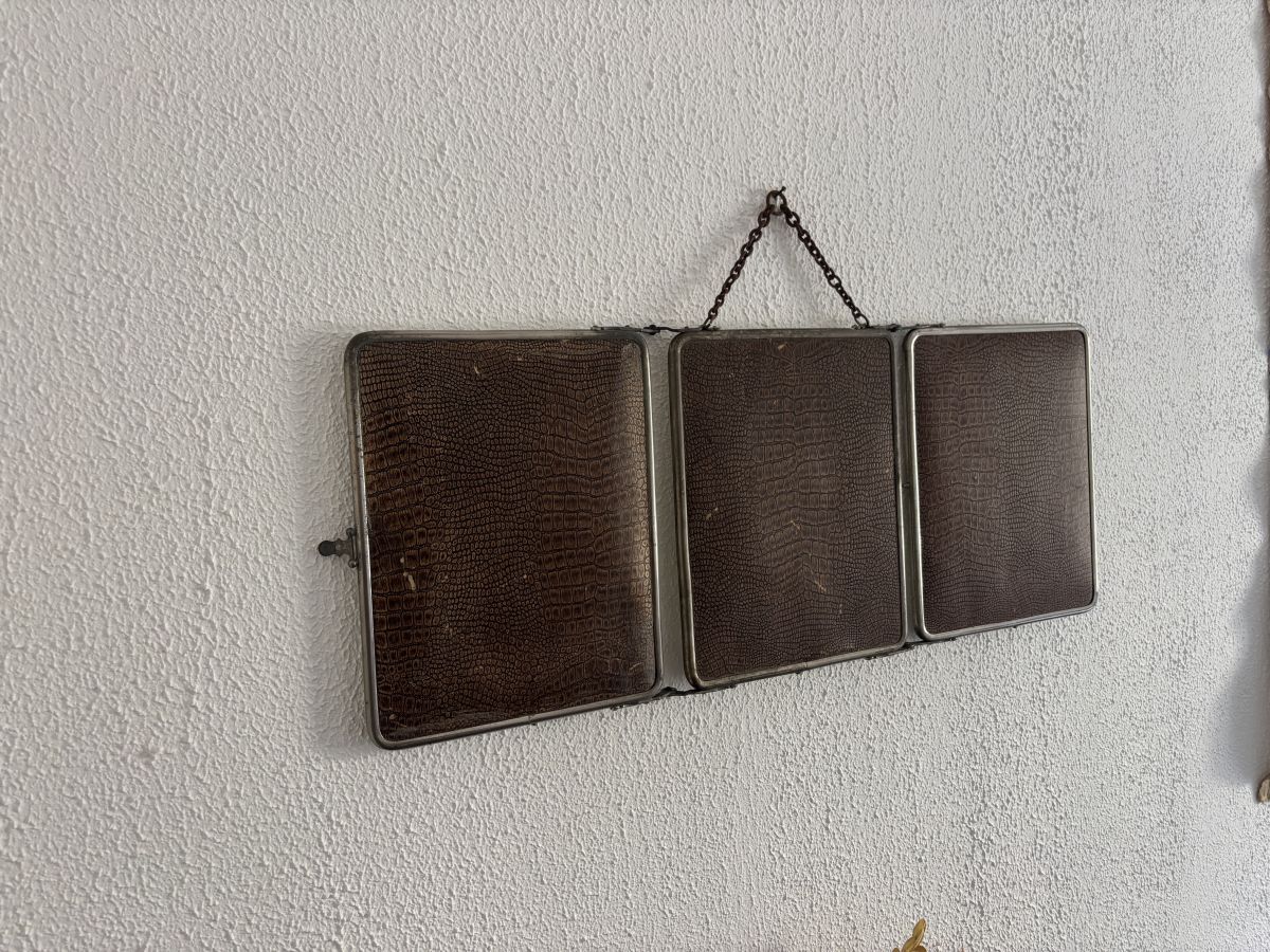 Ancien miroir triptyque de barbier coiffeur en métal nickelé et simili crocodile marron circa 1930 en bon état.