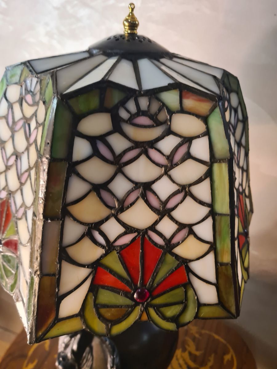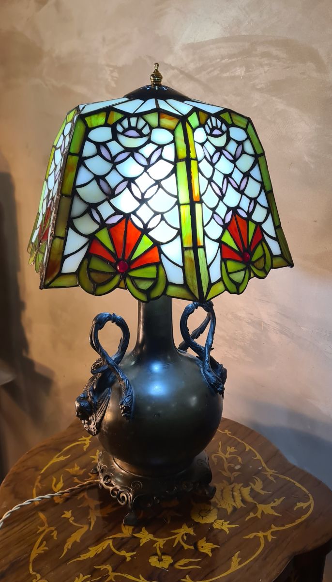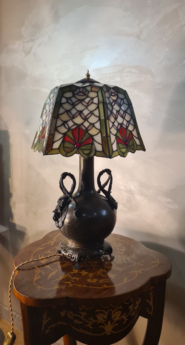 lampe cariatide bronze 1900 art nouveau avec jolie abat jour pate verre vitrail , style tiffany studio 56x31 6kg magnifique et rare