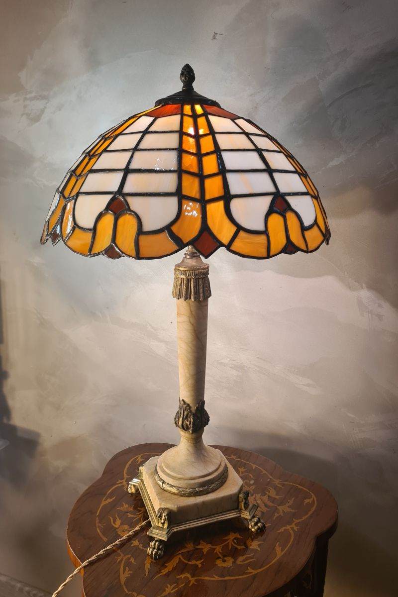 lampe empire bronze et marbre grand format 70x43 6kg ,et superbe abat jour verre et plomb traces et felures style tiffany ,voir photo mais ne gene pas a la qualité de cette lampe vintage ,elec refaite ,du support a la prise, superbe