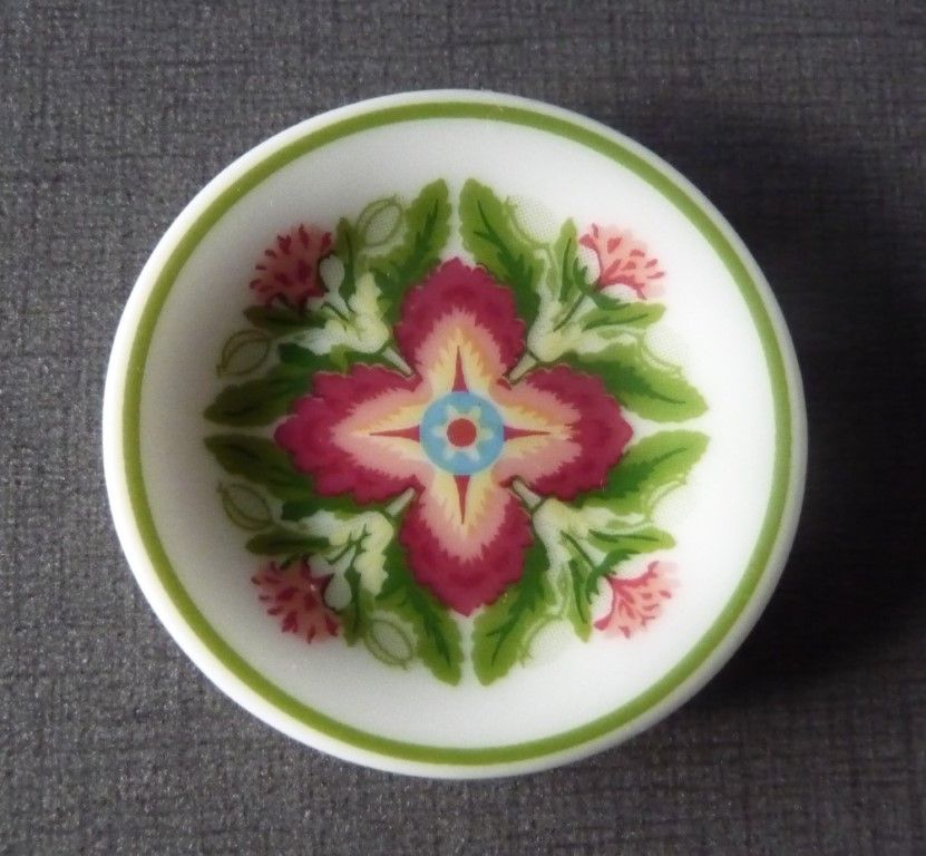 Fève forme de plat décor floral, BERNARDAUD, modèle Trianon. Porcelaine de Limoges, fabriquée en France.